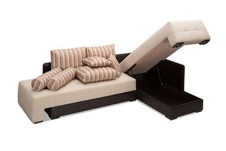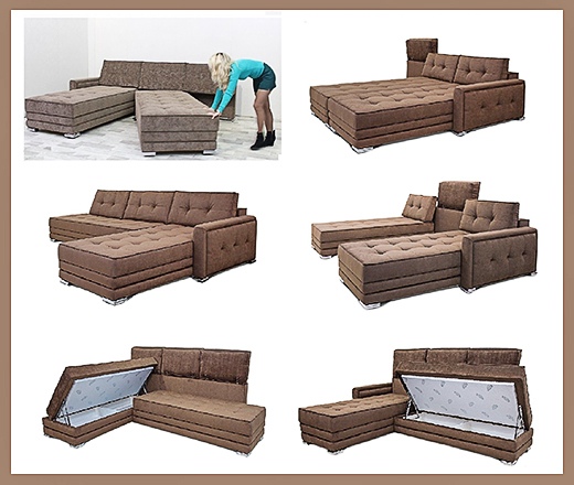 В угловых моделях после поворота одной из частей матраса (правой или левой) обе половинки фиксируются с помощью специального крючка. В отличие от прямых диванов угловые дополняются большими ящиками для хранения не только постельного белья, но и подушек, одеял.