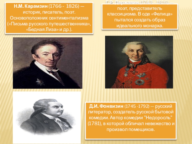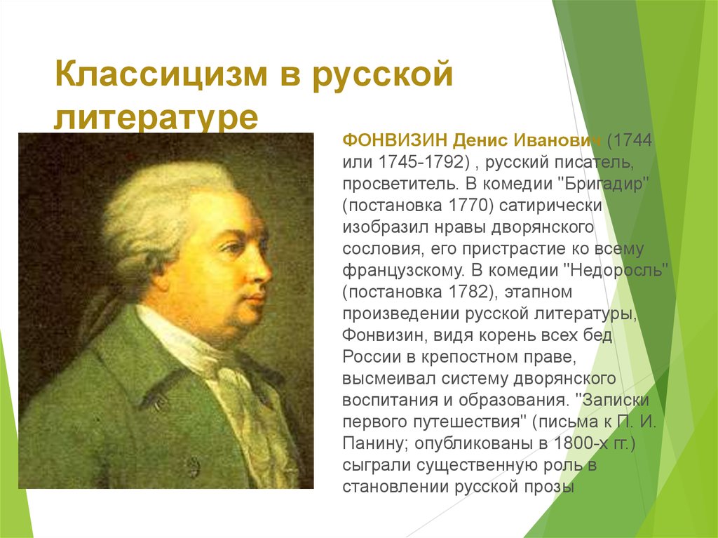 | ФОНВИЗИН Денис Иванович | 1745-1792 | «Бригадир», «Недоросль», «Лисица-казнодей», «Послание к слугам моим» |