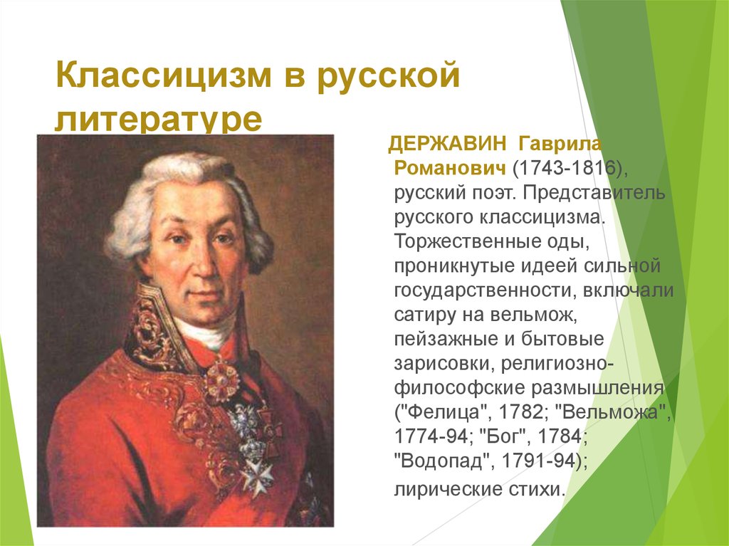 Сокрушительный удар по системе русского классицизма нанёс Гаврила Романович Державин, начинавший как поэт-классицист, но нарушивший в 1770-е гг.