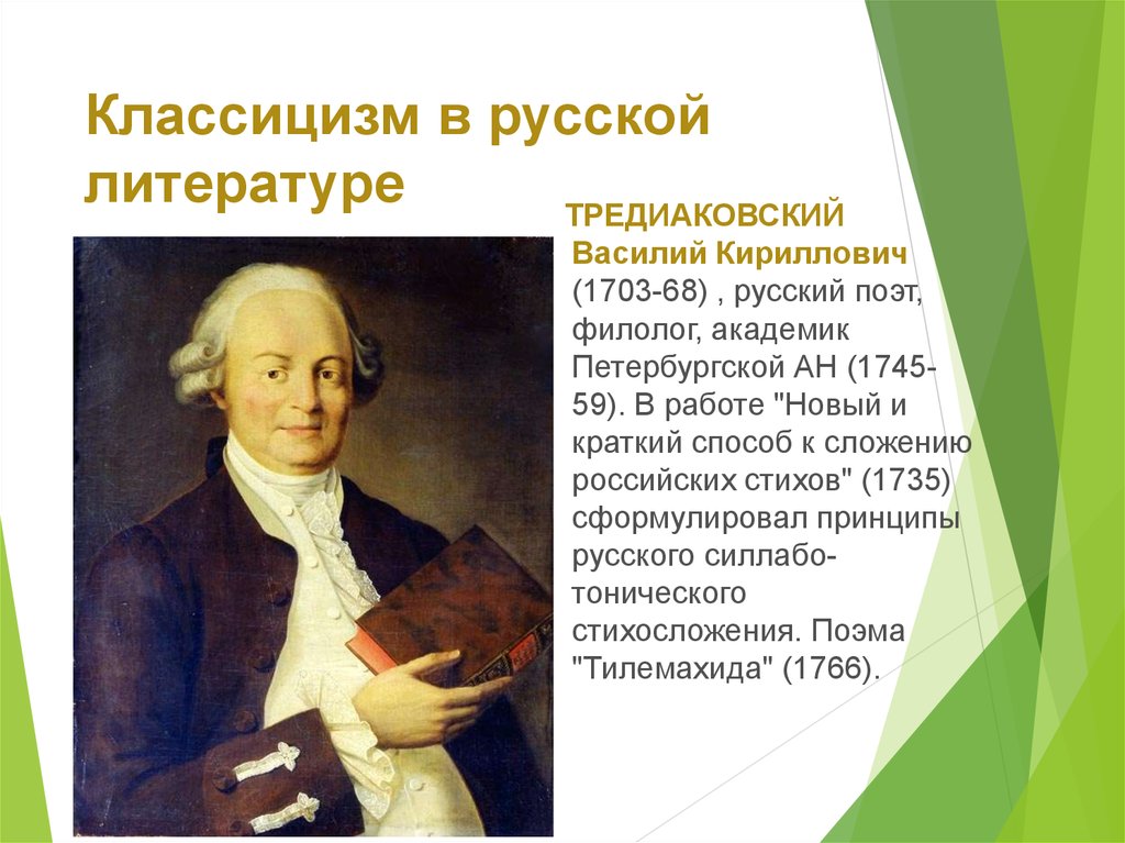 | ТРЕДИАКОВСКИЙ Василий Кириллович | 1703-1768 | «Тилемахида», «Новый и краткий способ к сложению российских стихов» |