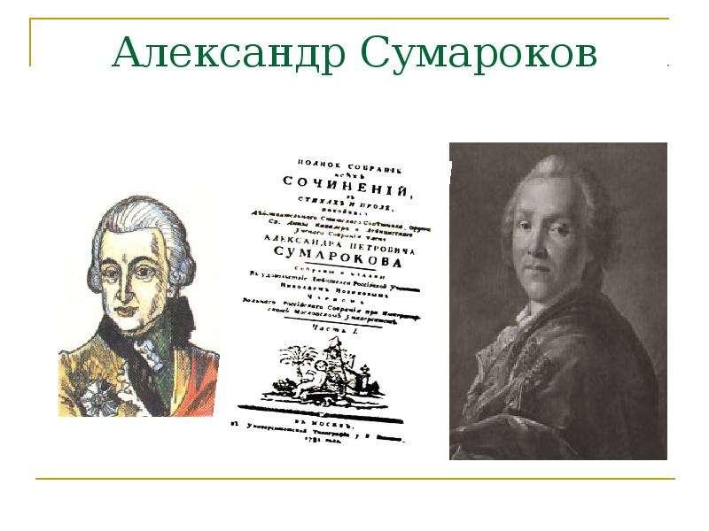 Создателем русской трагедии – Александр Петрович Сумароков. Его патриотические пьесы были посвящены наиболее заметным событиям российской истории. Заложенные Сумароковым традиции продолжил драматург Яков Борисович Княжнин.