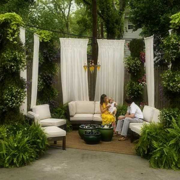 Создать уединенное местечко для отдыха, не возводя капитальных построек, можно с помощью нескольких столбиков и плотных занавесок. Такая импровизированная беседка станет уютным и романтичным местом для отдыха в теплое время года, а процесс ее возведения не потребует больших усилий и затрат.