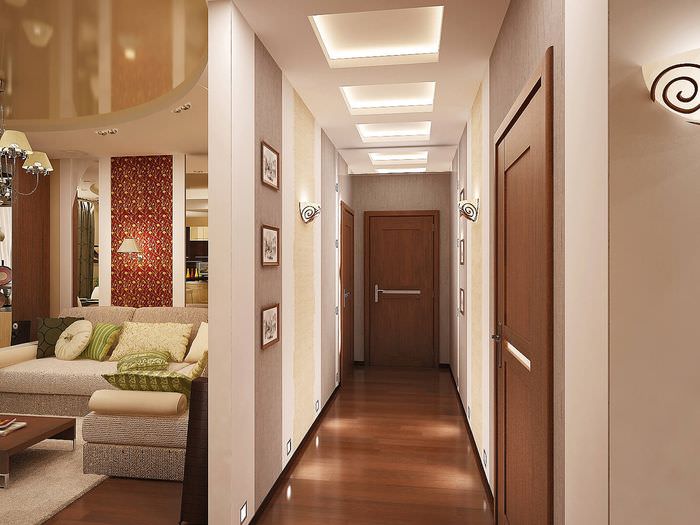- В узком коридоре в панельном здании их необходимо сочетать с яркими или темными на коротких стенах (например, вокруг входной двери).