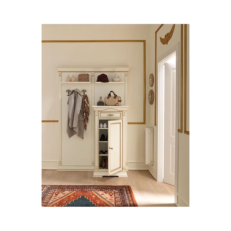 - Белую прихожую с обрамлением золотом используют чаще всего в богатых классических интерьерах.