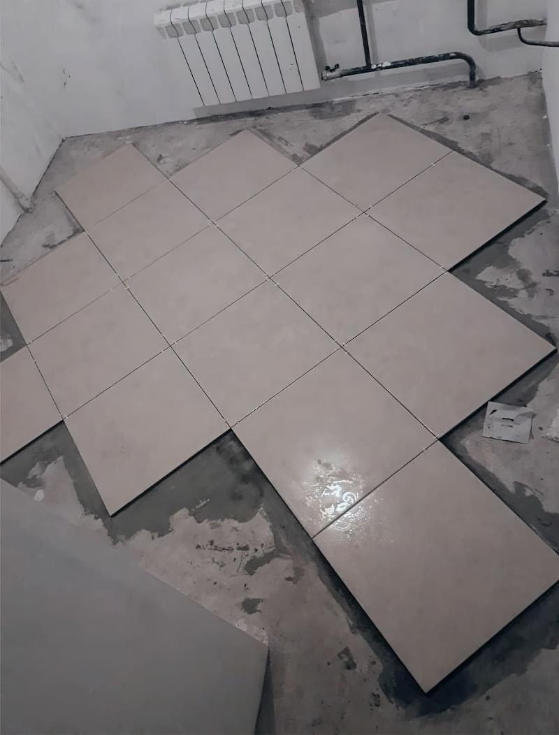 Это один из самых сложных способов раскладки, который требует от мастера определенного опыта. Монтаж отделочного материала начинается с угла. Первый ряд представляет собой плитку, разрезанную по диагонали. После укладки двух равнобедренных треугольников переходят к следующей линии. Швы должны пересекаться под углом в 90 градусов. Проверить их ровность можно при помощи лазерного уровня.