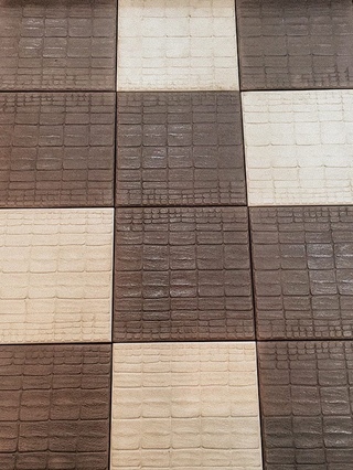 - Керамогранит. Искусственный материал, имитирующий природный камень. Производится методом полусухого прессования, после чего обжигается при температуре 1200-1300 °C. В его состав входят каолины, кварцевый песок, полевые шпаты и пегматиты.