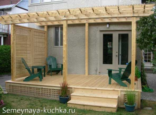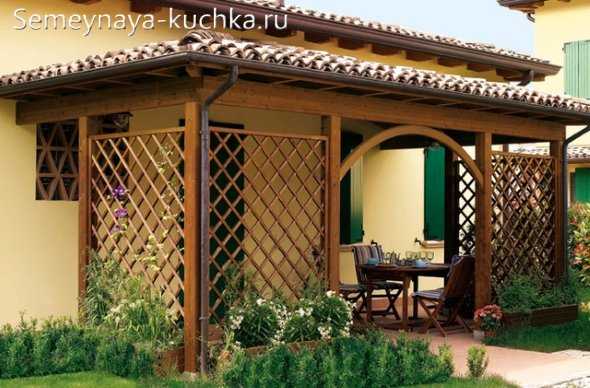 По этому признаку отличают отдельно стоящий ландшафтный элемент и навес, пристроенный к дому перед входом или представляющий собой продолжение террасы.