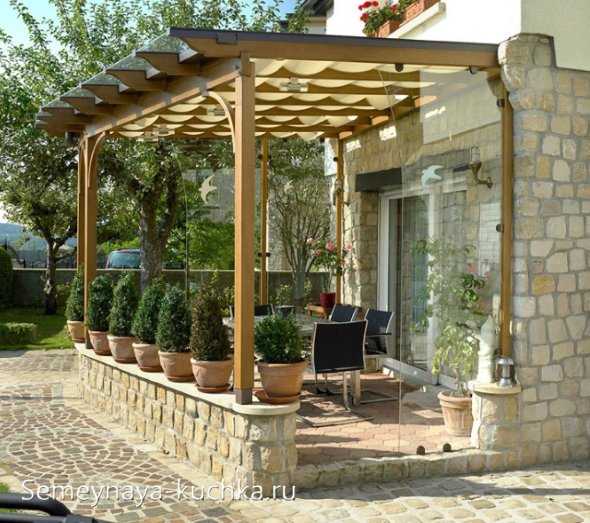 Навесная конструкция позволяет создать великолепную зону отдыха на свежем воздухе