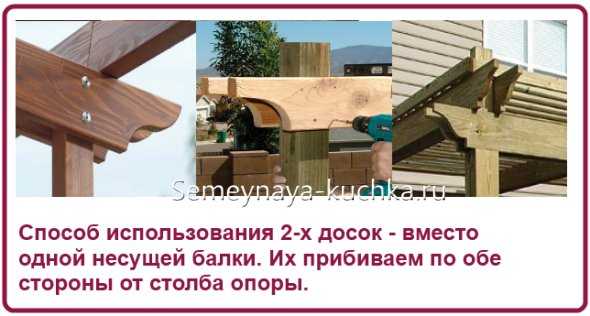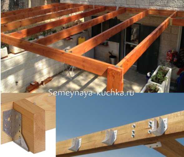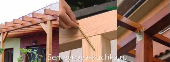 Расстояние промежутка между стропилами составляет 1 метр. Можно крепить навес к стене или опорной доске одной стороной стропил, а вторая ложится на стойки. Для фиксации берутся саморезы или уголки из стали.