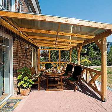 Один из ответственных этапов сооружения деревянных навесов к дому – выбор материала конструкции. Подойдет любой вариант, но при возможности постарайтесь использовать сосну. Дерево для сооружения этого вида отличается хорошими показателями долговечности, небольшим весом и приятным внешним видом.