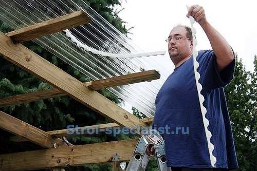 Листы кровельного материала нарезаются по размеру. Затем крепятся к обрешетке. Предварительно в поликарбонате проделываются отверстия под саморезы.