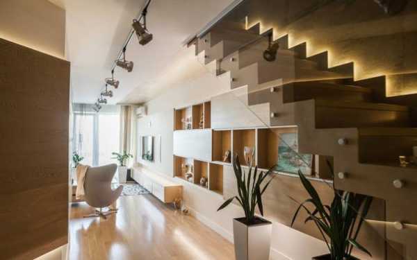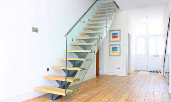 Очень оригинально смотрится подсветкаступеней: она сделает конструкцию более воздушной и поможет не споткнуться приподъеме. В небольших холлах предпочтительнее дизайн лестниц без подступенков: прозрачная конструкция визуально «растворяется» в пространстве и не загромождает его, а уж стеклянные ступени практически делают её невесомой!