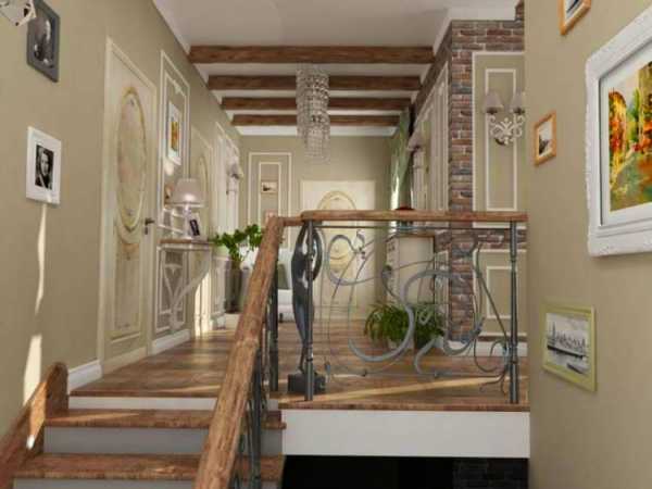 Характерными чертами кантри является дерево и обилие текстильных изделий с орнаментом. Для оформления прихожей с лестницей оптимально подойдет береза, ольха или сосна.