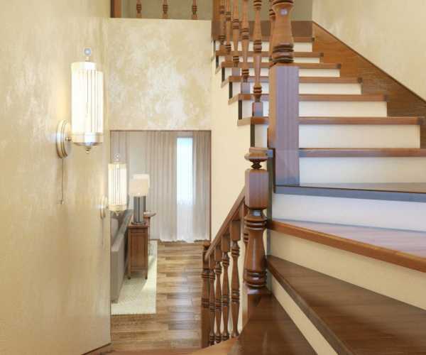 Присущи классическому интерьеру прихожей с лестницей сдержанные формы, приглушенные тона, преимущественно пастельной палитры. В декоре классической лестницы допустима резьба и завитки.