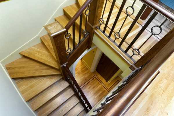 Винтовая лестница более компактна. Она создается вокруг центровой опоры, которая проходит сверху вниз: ступени обычно крепятся прямо на нее, как спираль. Винтовая лестница имеет оригинальный вид, но для перемещения она менее удобна, чем маршевая. Такая конструкция считается небезопасной, если в доме есть дети или пожилые люди.
