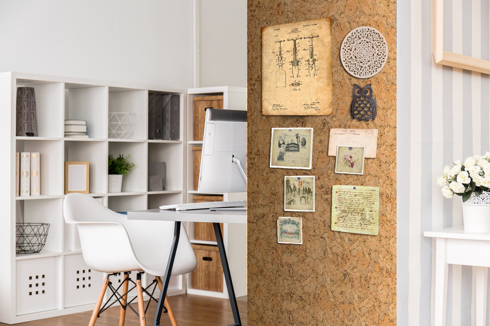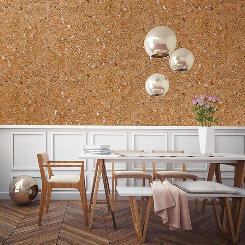 Материал имеют множество фактур, цветов и узоров, что позволяет дает реализовывать самые смелые идеи оформления пробковых стен. Они отлично смотрятся во всех помещениях: