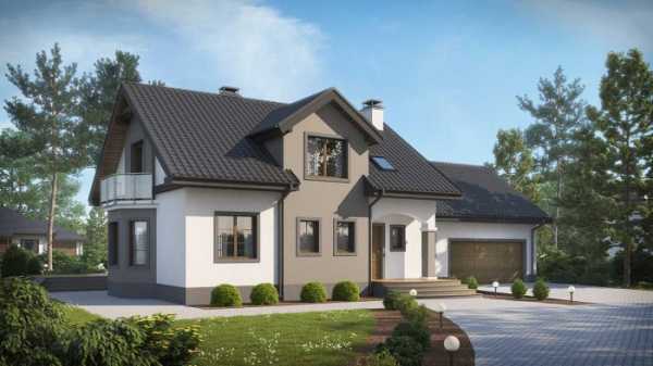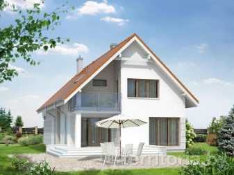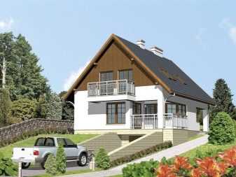 Здесь стоит обратить внимание на расположение гаража. Такой тип строительства удобен и практичен, ведь в гараж можно попасть прямо из дома, и при этом он не холодный. Мансарда оснащена небольшим балконом и нестандартными окнами, при входе в дом имеется веранда.