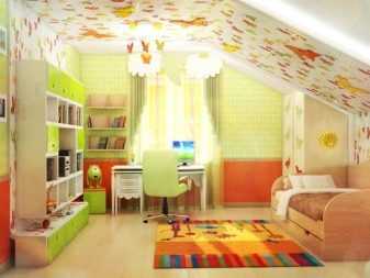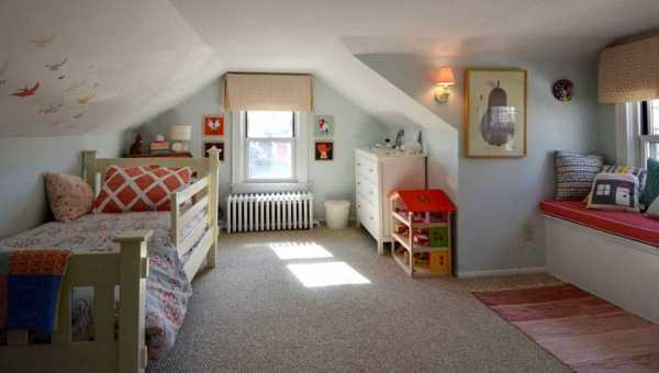 Напомним, что скошенные потолки могут вызывать дискомфортные ощущения у ребёнка. Следует максимально компенсировать этот фактор при помощи умелого использования цветов и материалов