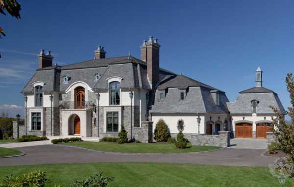 Особенность данного дизайна – в том, что у мансарды с другими этажами одна общая кровля. Это видно по высокому окну слева. Терраса построена в дугообразной форме, гараж соединен с домом.