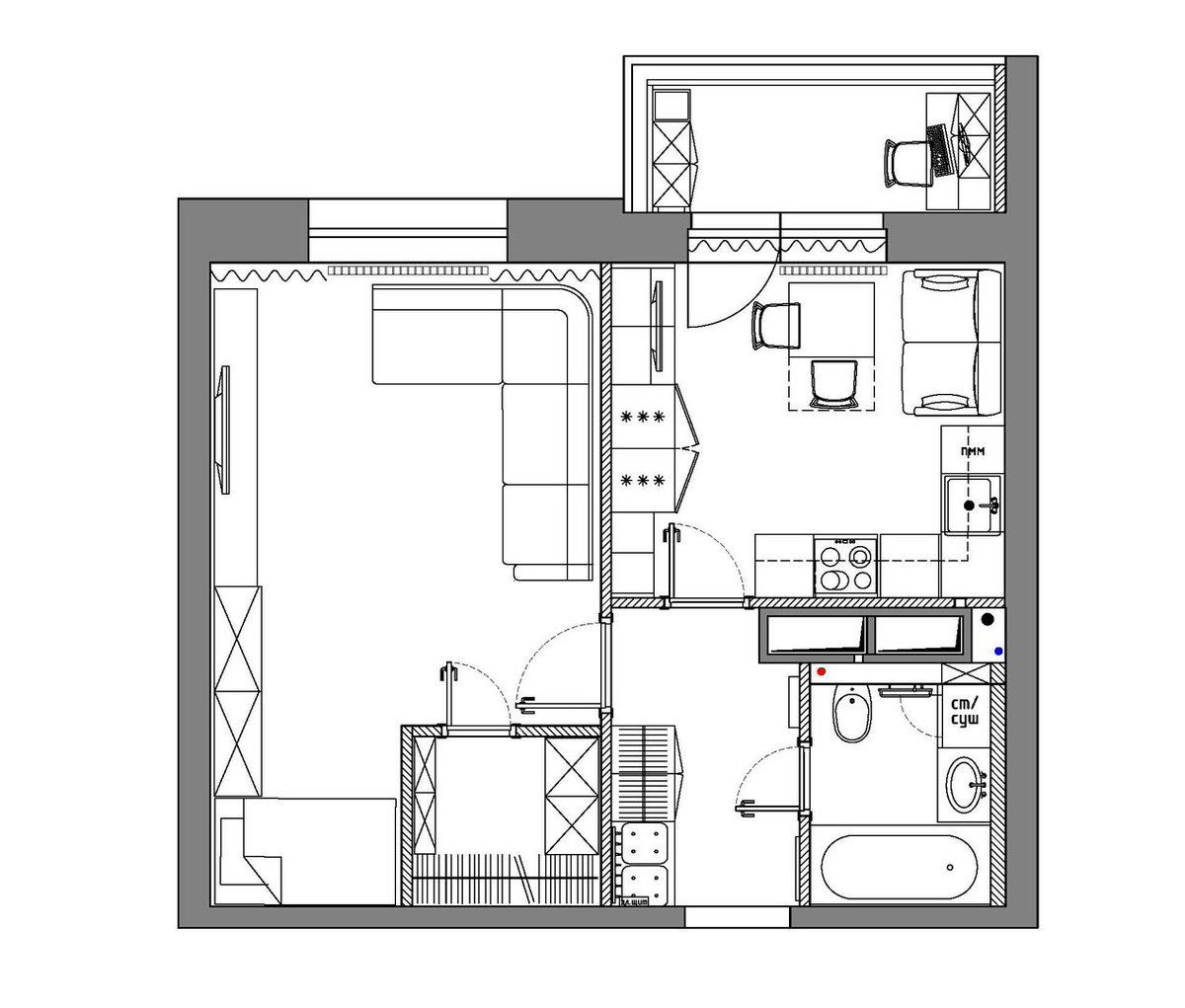 По возможности сводим эту часть квартиры к минимуму или убираем вообще – пустая трата пространства не несущая никакого функционала. - Ванная комната. Туалет с ванной, как правило, в небольшой квартире совмещён, но имеет смысл отделить унитаз от ванны небольшой перегородкой в гигиенических целях. При проживании в квартире более 1 человека, есть смысл зонирования санузла на 2 самостоятельные площадки, делая ванну проходной частью. Расположение менять не практично.