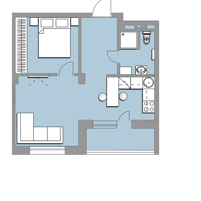 Благодаря перепланировке, номер состоит из гостиной-спальни, кабинета, кухни, столовой и санузла. Однокомнатная квартира была разделена с помощью фальш-стены и нескольких типов полов.
