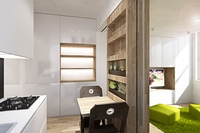 - Рабочая зона. Как минимум – откидная полка для ноутбука, как максимум полноценное рабочее место метр на метр со столом, полками, стулом. Стоит учесть, что это должно быть не смежное с кухней или с ванной место, а более уединенное, максимально удалённое от мест общего пользования.