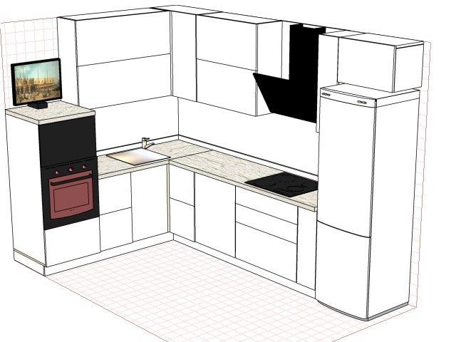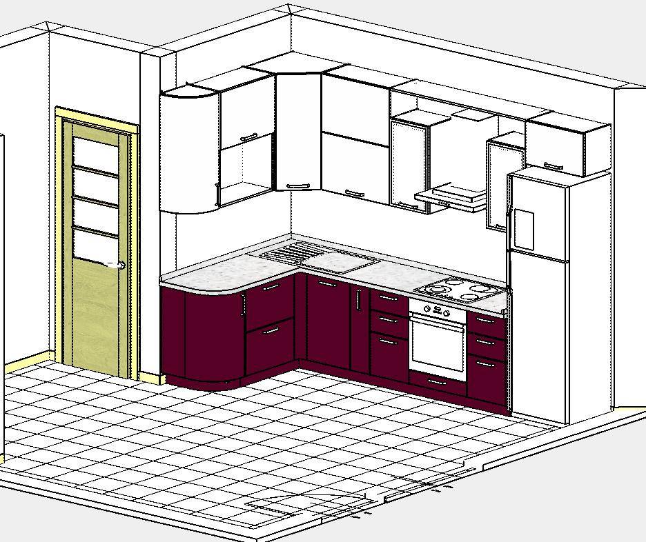 При этом нужно учитывать одну деталь: Если кухня проектируется в большое помещение, то можно проектировать любой угол, а, если в маленькое помещение – то проектируется стык 90 градусов, причем, меньшее крыло делается под столешницу глубиной 420 миллиметров (в него, разумеется, уже нельзя встроить духовой шкаф или врезать варочную панель).