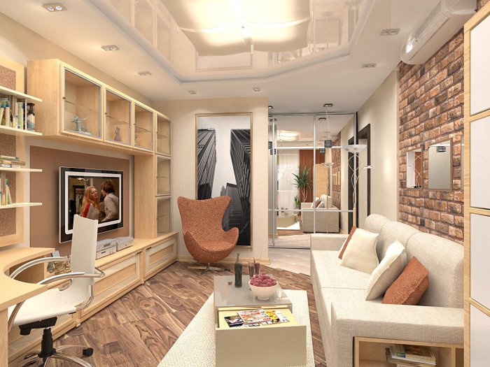 Этот вариант считается самым неудачным – придется сильно постараться, чтобы удобно разместить мягкую мебель, телевизор, журнальный столик, какие-либо шкафы для вещей.