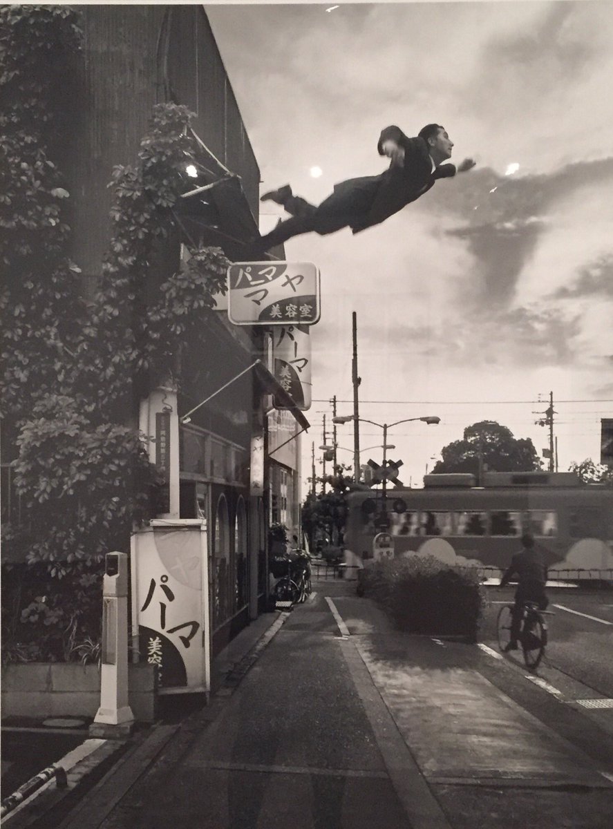 Улица безлюдная, кроме того, внизу справа на фото сзади только что проехавший велосипедист.Человек, находящийся в полной левитации между небом и землей, не остановился и не повернулся; он продолжает свой путь, безразличный к этому поступку, который, тем не менее, кажется нам необычным, даже сбивающим с толку. Свидетельские показания, собранные Сидрой Стич у Гарри Шанка, говорят нам, что велосипедистом был фотограф Джон Кендер и что идея включить его на фотографию исходила от самого Гарри Шанка.