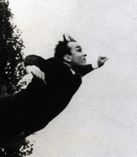 Ив Кляйн поднимается со столба у входа в павильон, его лицо обращено к небу, его скрестив руки, художник не падает, а взлетает.