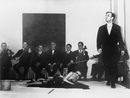 «Жилая Кисть для рисования » Чуть больше месяца спустя, июнь 5 мая 1958 года Кляйн исполнил свою первую картину «Живая кисть» в шикарная квартира на острове Сен-Луи в Париже. В этом спектакле обнаженная модель нанесла синюю краску на торс, а затем нажала краску на холст на полу, образуя плавные узоры абстрактных искусство, по постановке художника.