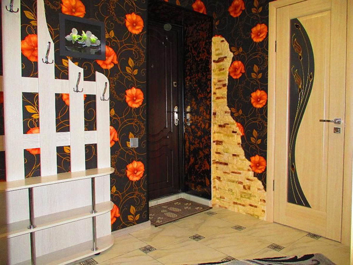 К сочетанию обоев мы привыкли. Настоящим взрывом креатива может стать комбинирование материалов. Обои с камнем, штукатурка с кирпичом, пластиковые панели с камнем на входной двери – идеи могут быть разные.