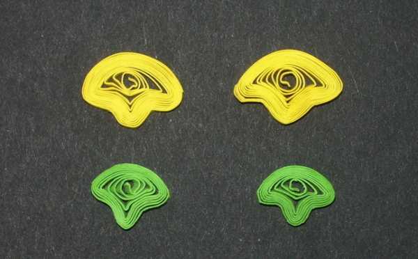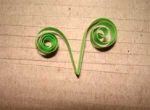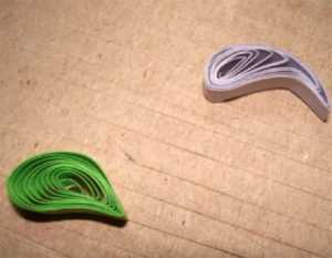 Теперь делаем листочки. Для этого скручиваем спираль из 2 полосок и придаем ей форму «Изогнутый лепесток».
