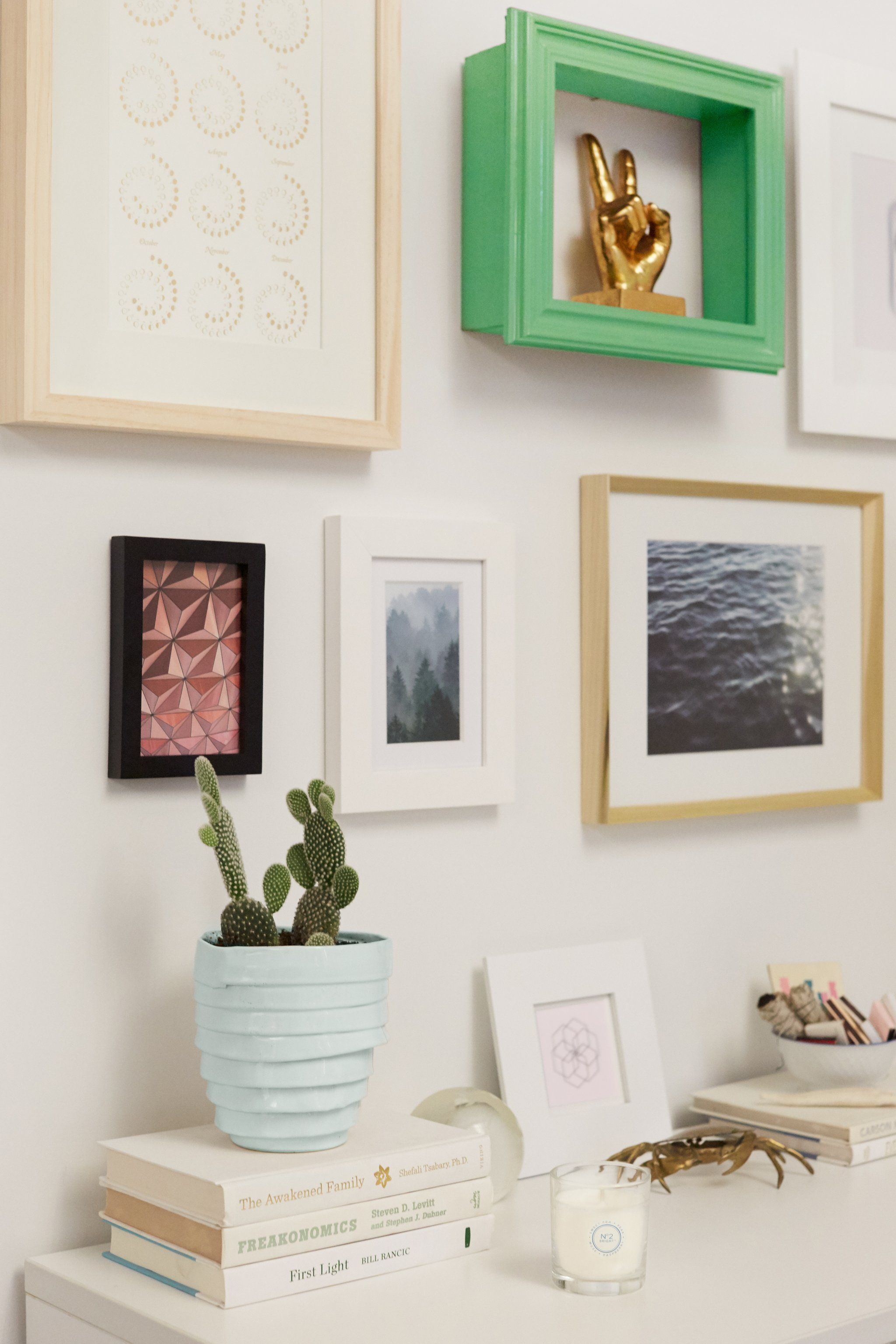 Создайте пространство, которое позволит вам обмениваться фотографиями с течением времени, что даст вам возможность поддерживать актуальность вашего декора.Попробуйте магнитную доску, которую можно повесить над столом или комодом.