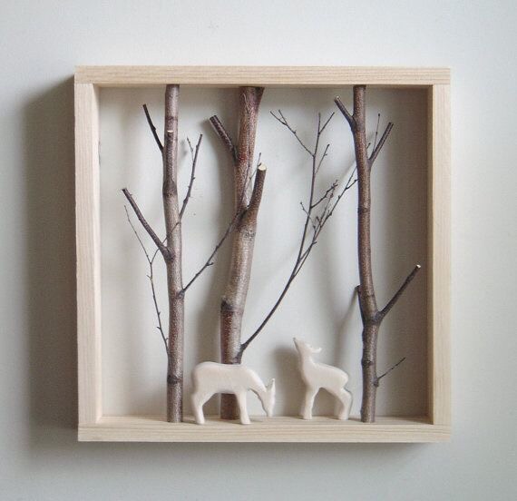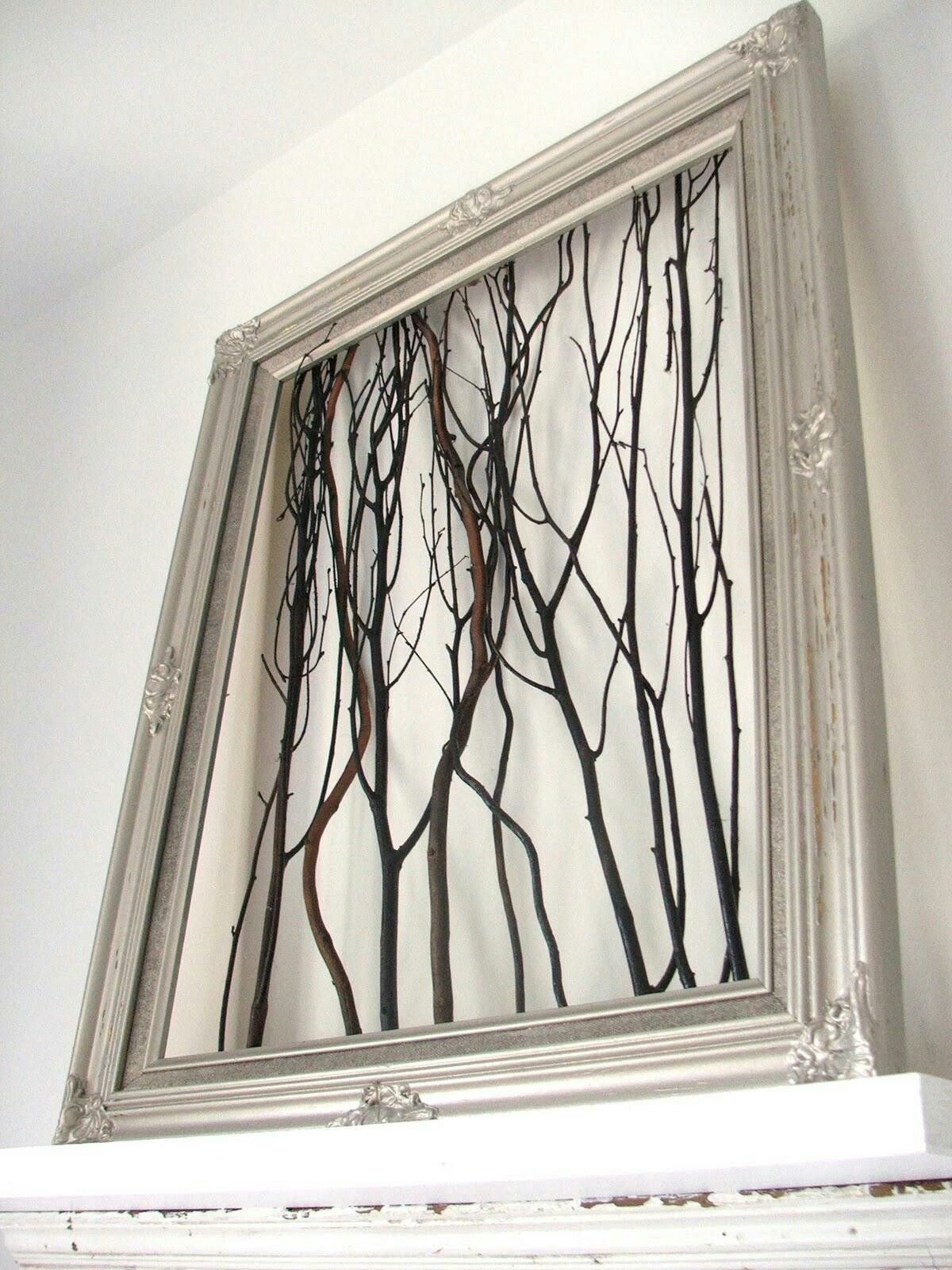 Интересным решением, которое позволит избежать излишней траты средств на фотообои, являются картины из веток. Например, ветки березы в интерьере выглядят очень изящно и по-русски. С помощью обрезков ивы можно создавать легкие «ажурные» композиции. Для этого достаточно сделать рамку из деревянной планки и прикрепить с помощью саморезов или степлера подобранные по размеру ветви. Отдельные веточки можно собрать в различные фигуры, создать современную графическую инсталляцию, декорируя картины доступными отделочными материалами.