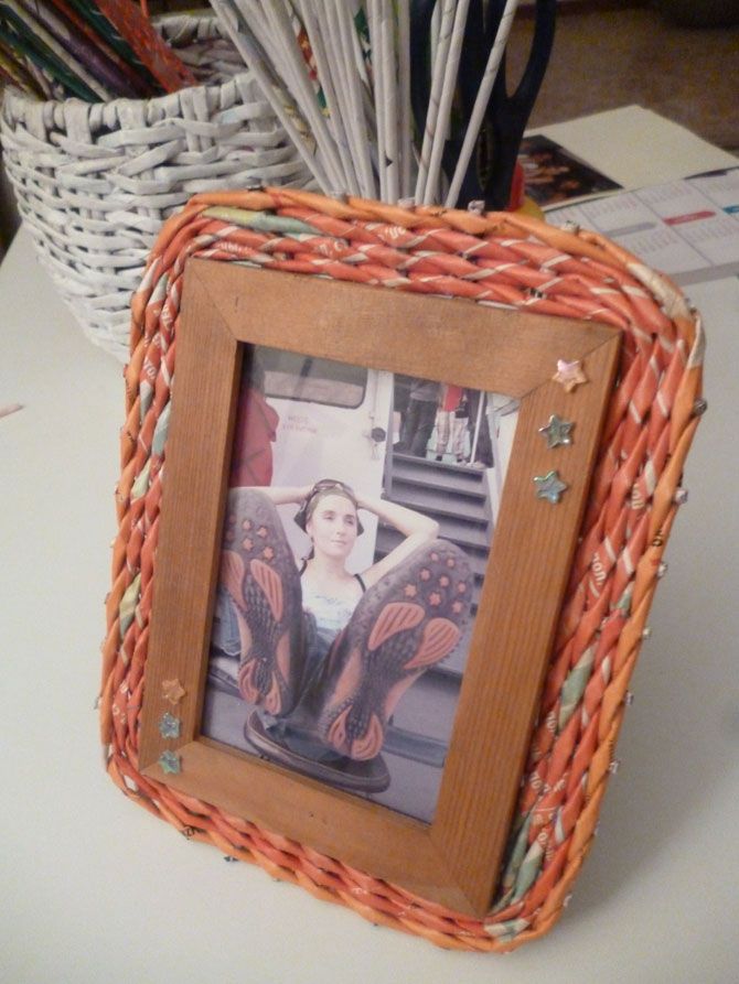 Из старых журналов также можно сделать декорацию для фоторамки. Каждый лист журнала разрезается на 4 равные части, затем каждая часть сворачивается в трубочку и закрепляется клеем. Этими трубочками, приклеивая встык, мы будем украшать нашу фоторамку из картона. Когда вся рамка будем заполнена, ее можно вскрыть лаком.