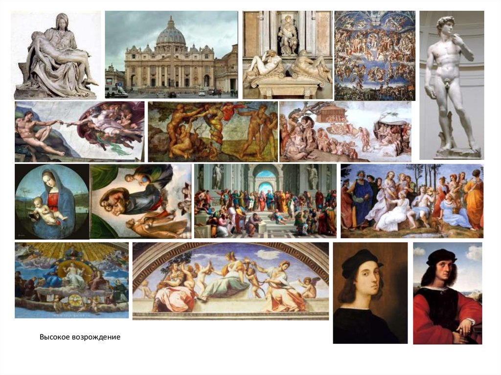 Три великих художника пришли из периода Высокого Возрождения , а именно Леонардо да Винчи, Микеланджело и Рафаэль. В это время было много других художников, которые освоили новые техники, такие как , сфумато, и квадратура. В то время как Раннее Возрождение происходило в основном во Флоренции как центральном художественном центре, Высокое Возрождение происходило в основном в Риме, которым руководил Папа. Многие художники были заказаны Папой Римским в его попытках восстановить город до его славы.