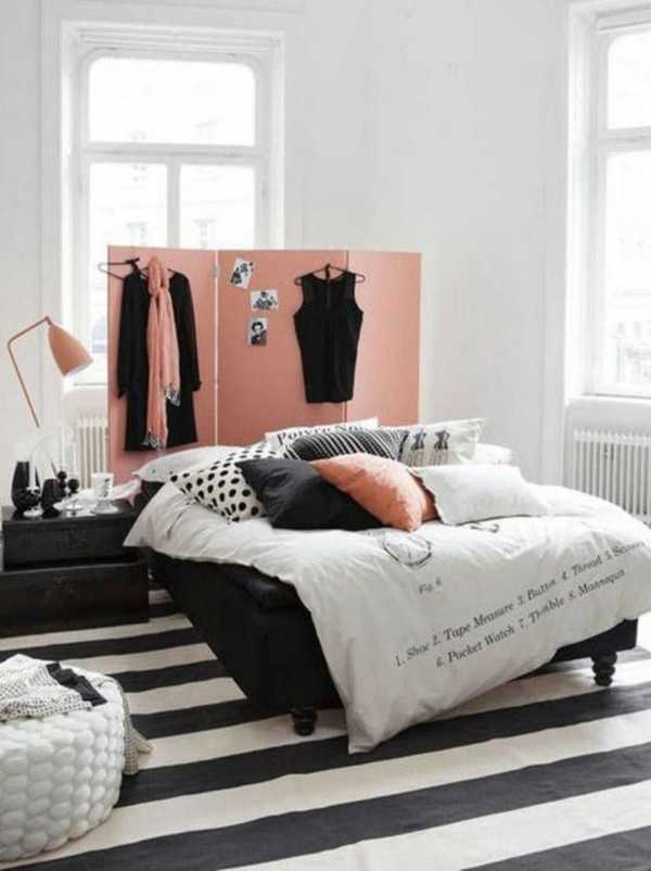 - Место для отдыха, то есть спальню, следует выделить в дальнем углу комнаты. В этом случае и свободного пространства будет больше, и беспокоящих вас перемещений меньше.