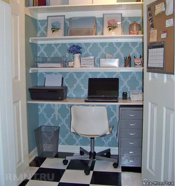Вот такой небольшой, но очень удобный кабинет может скрываться за дверью кладовой. В этом случае владельцы решили визуально расширить пространство за счет большого зеркала над монитором