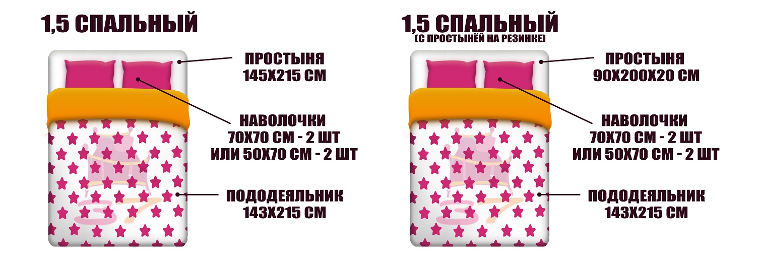 В 2-м наборе простынь и пододеяльник больше, чем в 1,5 спальном, а количество наволочек может быть увеличено до четырех, причем дополнительные две могут быть декоративными.