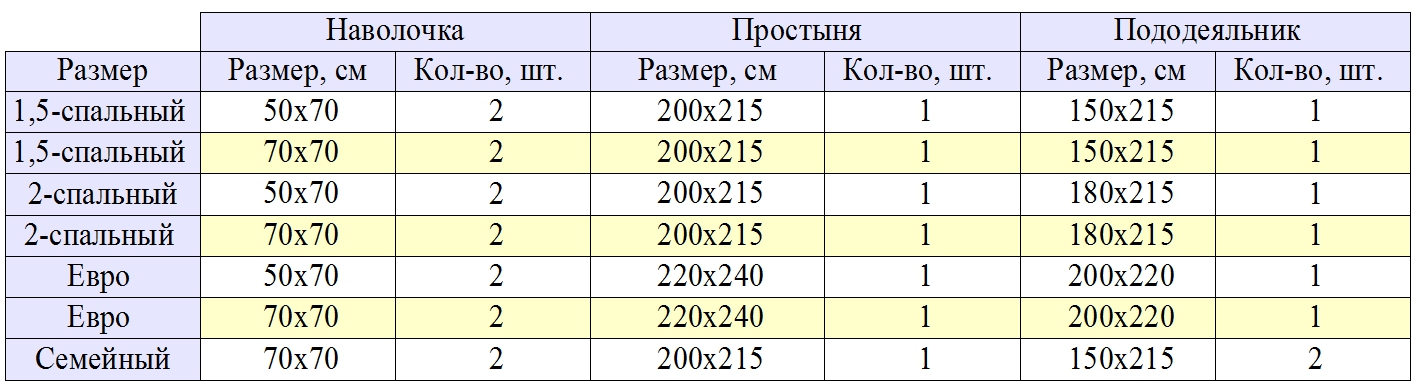 Таблица со стандартными для России размерами комплектов.
