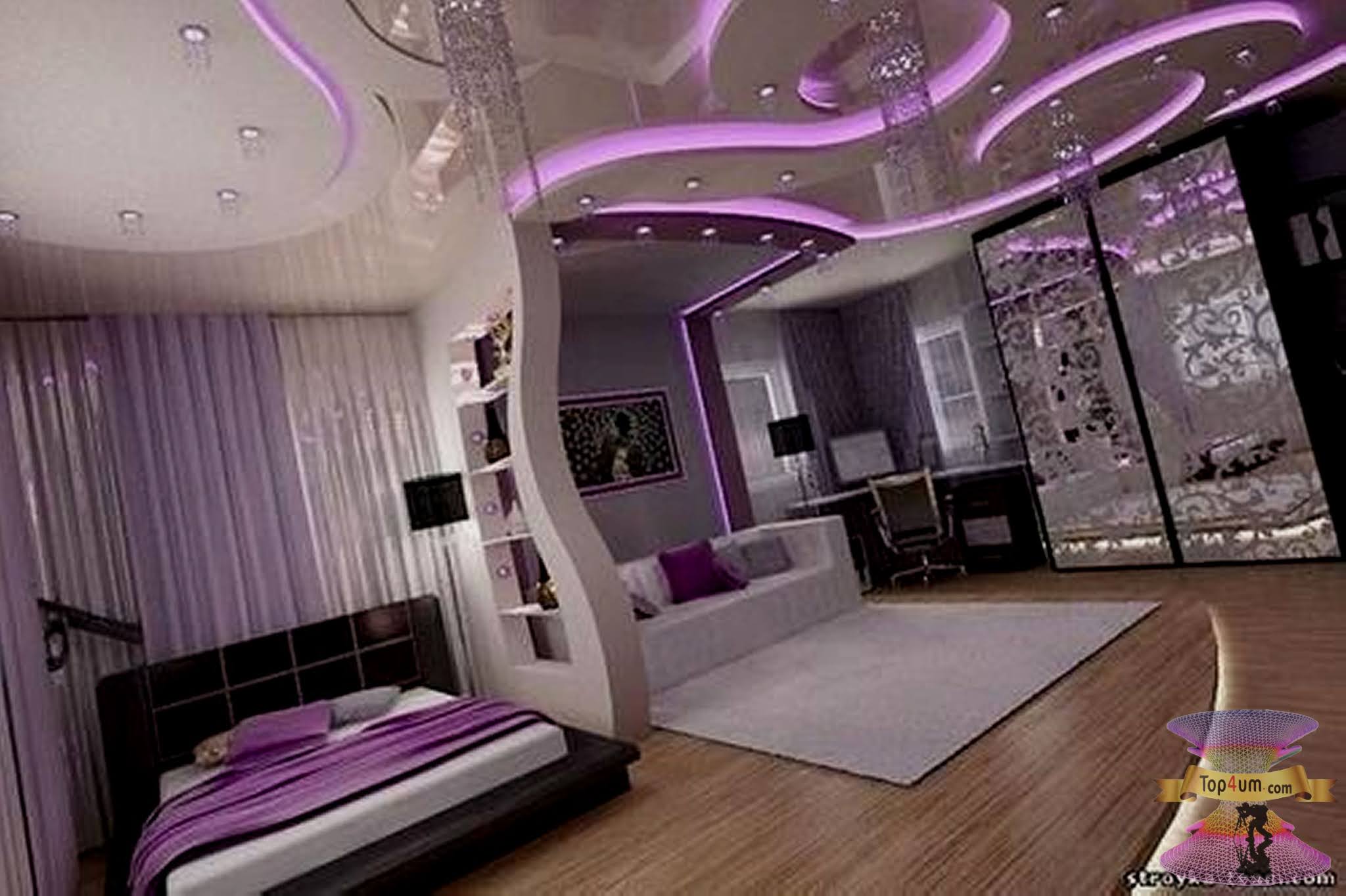 Для того, чтобы в комнате было комфортно не только спать, но и отдыхать, а также заниматься повседневными делами, помещение следует разделить на функциональные зоны с помощью арок, стеллажей, перегородок и декоративных конструкций.