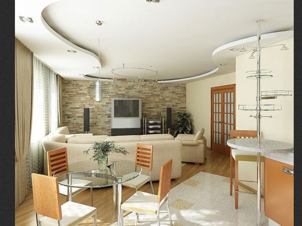Зонирование также можно производить при помощи гипсокартона, сделав ровные или гнутые вставки на стенах или потолке.