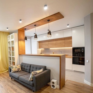 При создании дизайнерского проекта необходимо четко определить, где какая зона у вас будет располагаться. Отделить кухню от комнаты можно при помощи барной стойки или специальных дверей-купе.