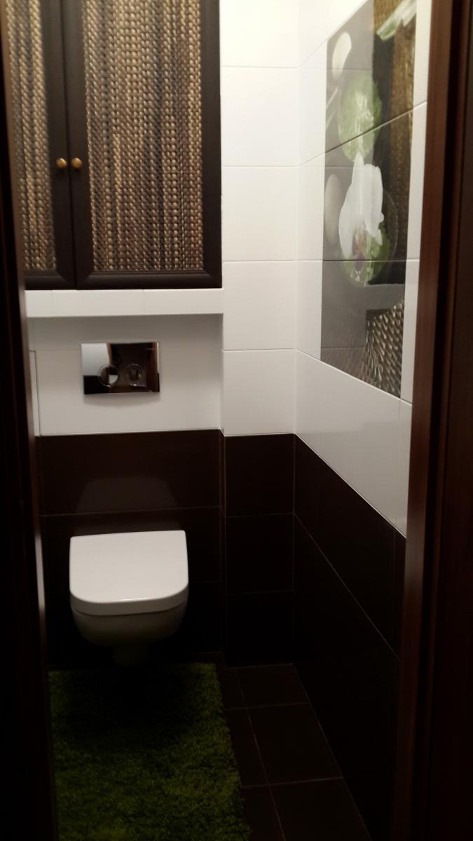 Довольно стандартный дизайн маленького туалета, правда качество фото хромает. Но на вкус и цвет, как говорится 🙂