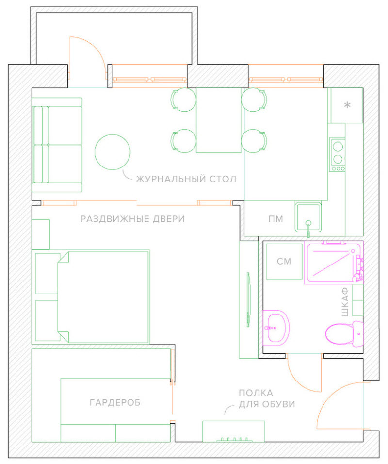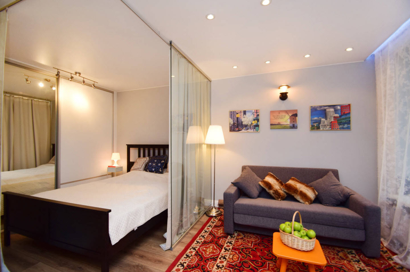Совет! Очень необычное, но удобное решение — раздвижные стенки между кухней, залом и спальней.