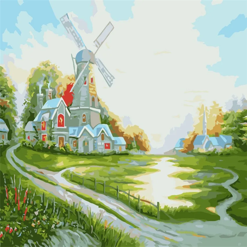 К ним относятся коричневые для мелких элементов и бежевый для корпуса ветряной мельницы. Немного зелени для кустов рядом с ним также помогает добавить всплески более ярких цветов.