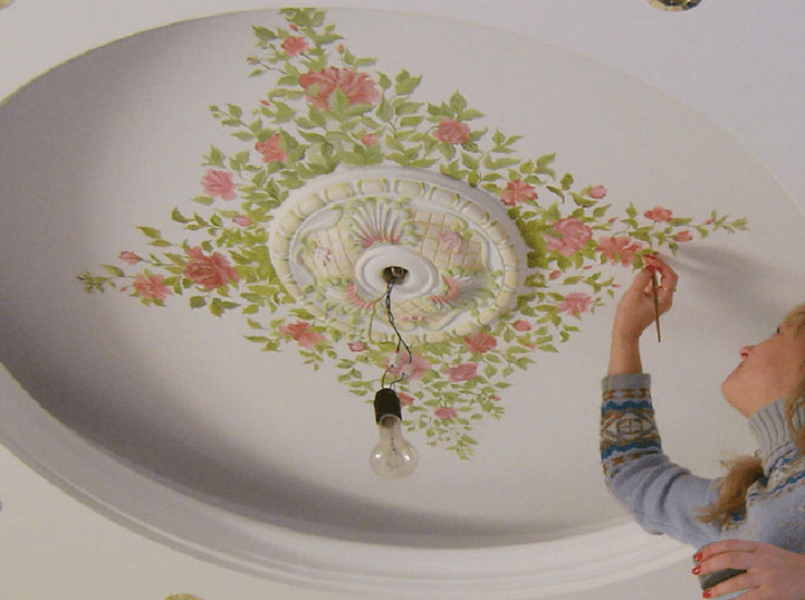 Не надо забывать, что качество объемной росписи напрямую зависит от тщательно подготовленной поверхности потолка и качества используемых красок и кистей.