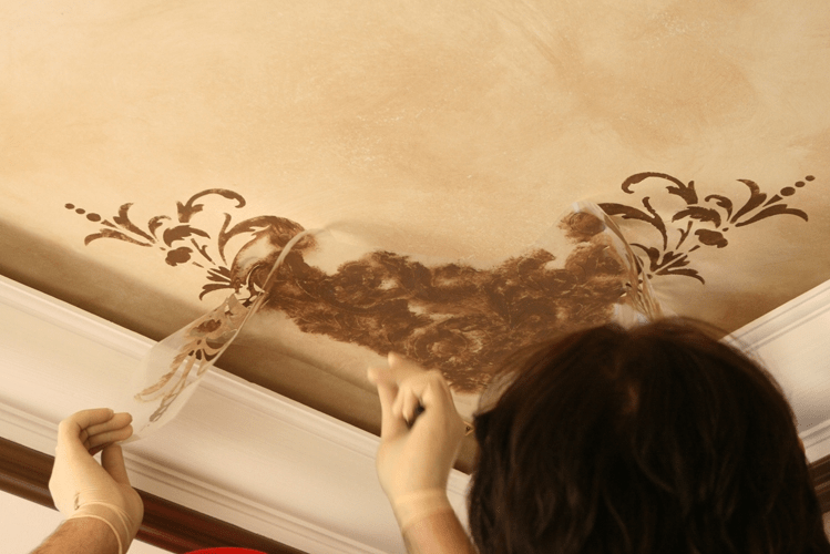 Для рисования можно воспользоваться и обычной фактурной тканью. Для этого ее смачивают в краску и легкими ударяющими движениями оставляют оттиск изображения на поверхности. Изображение 3. Такой же тканью можно обшить обычный поролоновый валик и, используя его, нанести рисунок на потолок.