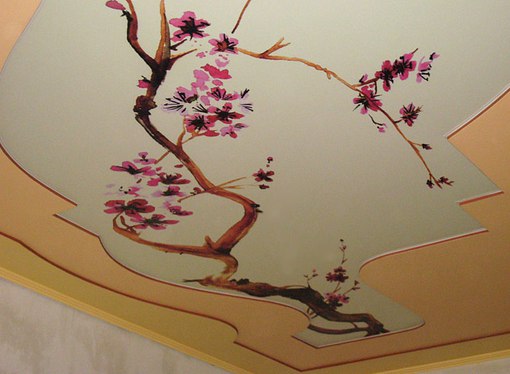 Необыкновенную красоту придаст потолку художественная роспись. Вы можете сделать её своими руками. Здесь важно учесть, чтобы комната была просторной, и потолки были высокими. Тогда, это еще больше подчеркнет неординарность украшения интерьера.